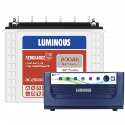Luminous 1400VA Eco Volt 1550 Inverter Capacity :-12 Volt, Capacity - 1400 VA, Max. Bulb Load - 1176 watt Battery Capacity :-Voltage - 12 Volt, Capacity - 200 Ah, Tall tubular inverter battery Key feature for Inverter :-Sine wave inverter, Fast battery charging with adaptive battery charging control technology Key feature for Battery :-Highly efficient and ideal for heavy duty application with excellent overcharge tolerance, superior performance during long and frequent power cuts and minimum maintenance Running Load :- 2 LED TV 40", 10 LED Bulb 9W, 7 LED Tubelight 24W, 5 Fans, 1 Fridge (250 Litre) Safety :- Overload protection with auto reset Warranty :- For Inverters - 24 months and for battery - 36 monthsnverter And RC 25000 200Ah Tubular Battery