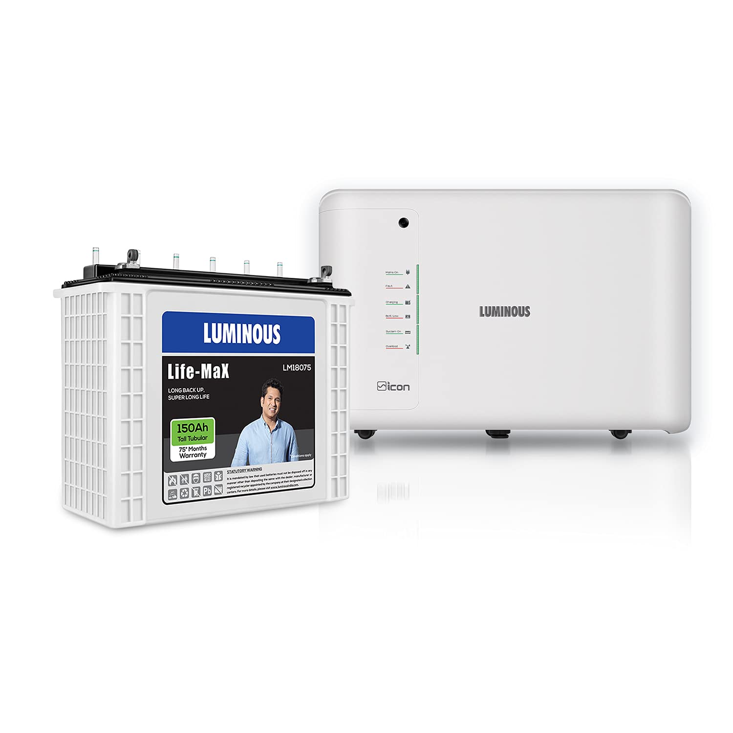 Pure Sine Wave technology Capacity - 900 VA, Rated Power - 756 W An integrated inverter battery design with an elegant, dedicated battery enclosure providing modern outlook for your house. Battery needs to be purchased externally. Icon supports all Tubular batteries from 150Ah - 220 Ah Next generation revolutionary inverter design for Hassel free battery water top Simplified inverter indications with three large twin colour LED lights representing Normal (Green) and User attention (Red) conditions. Fast Low voltage battery charging starts at 90V with full charging current. No Open wires as battery is encapsulated in the inverter asking it completely safe for children Warranty - 24 months Battery - Lifemax LM 18075 150 Ah capacity, 12V Warranty – 75* Months Next generation tall tubular battery with better charge acceptance and long Back up 30% more acid volume per ampere hour than ordinary tubular batteries. It has high purity, corrosion-resistant proprietary spine alloy composition for long battery life Extra-strong, flexible oxidation-resistant gauntlet for better performance and long life Puncture-resistant polyethylene separator which minimize the possibility of internal short circuits High Durability with sealed plastic housing Best Solution for areas with long and frequent power cuts Easy maintenance with level indicators. ₹44,490.00 ₹30,000.00
