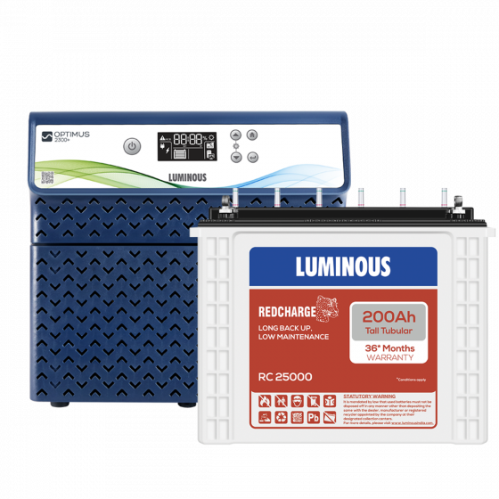 Luminous Optimus: A Digital Inverter which brings the modern outlook to your home & Office. It comes with a Digital display, Powerful Battery charger & Advance Sine wave technology which makes it a ideal inverter for your household /commercial needs. Pure Sine Wave Inverter Capacity : 2000VA /24V Rated Power : 1600 W Supports 2 unit of 12V lead acid battery. To be purchased separately. Advanced LCD display shows Inverter battery performance statistics User selectable output voltage (200V-240V) and charging current (8A-21A) for optimized performance Low voltage battery charging begins from 95V and fast charging from 135V input supply Mains By pass switch for supplying output directly from grid in case of a fault in Inverter Supports all Battery types (Flat, Tubular and SMF) and all battery capacities (80Ah-220Ah) 24 Month Warranty Key feature for Battery :-Highly efficient and ideal for heavy duty application with excellent overcharge tolerance, superior performance during long and frequent power cuts and minimum maintenance Running Load :-1 Fridge (250 Litre), 1 led TV 40", 3 fan, 2 tubelight, 1 LED bulb Safety :- Overload protection with auto reset Warranty :- For Inverters - 24 months and for battery - 36 months ₹74,200.00 ₹49,600.00 The Luminous Optimus 2300 Inverter paired with the RC 25000 200Ah Tall Tubular Battery is a robust power backup solution for residential or commercial use. Here's a brief overview of each component: 1. **Luminous Optimus 2300 Inverter**: This is a high-capacity inverter designed to efficiently convert DC power from batteries into AC power for running various electrical appliances during power outages. The "Optimus" series from Luminous usually implies advanced features such as higher efficiency, better voltage regulation, and possibly additional smart features for monitoring and control. 2. **RC 25000 200Ah Tall Tubular Battery**: This is a deep-cycle, high-capacity battery designed to provide long backup hours. The "RC 25000" designation suggests a high reserve capacity, meaning it can sustain power output over an extended period without needing a recharge. The "Tall Tubular" design typically indicates robust construction and better performance in terms of cycle life and reliability. When combined, these components form a reliable power backup system capable of providing uninterrupted power supply during outages, ensuring the smooth functioning of essential appliances and equipment. However, it's essential to ensure proper installation and maintenance to maximize the lifespan and performance of the system. Additionally, considering factors like load requirements and expected outage durations can help in selecting the right capacity for both the inverter and battery.