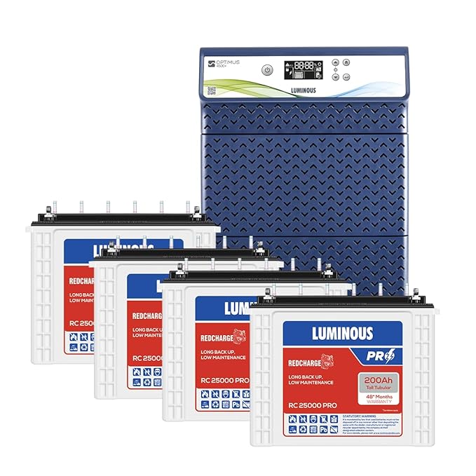 Luminous HKVA Inverter for Home, Office & Shop with Luminous Battery, Optimus 4500+ Pure Sine Wave 4000VA,48 Volt Inverter with Red Charge RC 25000 PRO Tall Tubular 200 Ah- 4 Batteries Combo. Capacity- 4000 VA, Maximum bulb load- 3924 W Technology- Sine Wave Technology 4KVA 48V No of battery supported- 4NO Battery (12V) Display: Informative LCD display which shows real time performance statistics Charging current: User can choose charging current between (8A-18A) for optimized performance Optimized performance: User can choose Output voltage between (200V-240V) to optimize between Longer Backup time and Performance Fast battery charging: Low voltage battery charging begins from 95V and fast charging from 135V input supply Mode selector: Eco and UPS mode available Complete safety for your home with protection features and alarms on short circuit, overload, over-temperature and low battery Safety for your equipment as it supplies grid like power to the connected load Supports all Battery types (Flat, Tubular and SMF) and all battery capacities (80Ah-250Ah)