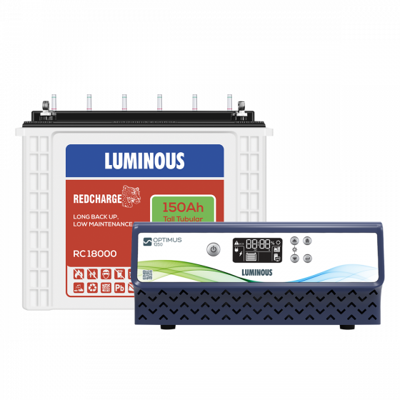 Pure Sine Wave Inverter Capacity : 1100VA /12V Rated Power : 924 W Supports 1 unit of 12V lead acid battery. To be purchased separately. Advanced LCD display shows Inverter battery performance statistics User selectable output voltage (200V-240V) and charging current (8A-18A) for optimized performance Low voltage battery charging begins from 95V and fast charging from 135V input supply Mains By pass switch for supplying output directly from grid in case of a fault in Inverter Supports all Battery types (Flat, Tubular and SMF) and all battery capacities (80Ah-220Ah) 24 Month Warranty RC 18000 The economical range of tubular inverter batteries with high performance, made using rugged tubular plates. These batteries require minimum maintenance and withstand long and frequent power cuts. The Optimus 1250 Inverter RC paired with an 18000 150Ah tubular battery is a powerful combination designed to meet high-energy demands efficiently. The inverter, with its 1250-watt capacity, offers robust performance suitable for both residential and commercial applications. Its built-in inverter technology ensures stable power delivery, protecting your sensitive electronic devices from voltage fluctuations and power surges. Complementing the inverter is the 18000 150Ah tubular battery, known for its durability and long-lasting performance. Tubular batteries are renowned for their deep discharge capabilities, making them ideal for backup power solutions. With a capacity of 150Ah, this battery can provide ample power to sustain essential appliances and electronics during power outages or in off-grid locations. The combination of the Optimus 1250 inverter and the 18000 150Ah tubular battery offers reliable power backup solutions for various applications, including homes, offices, shops, and even remote sites where access to the grid is limited. Whether you're looking for a backup power solution for emergencies or seeking to harness renewable energy sources through solar or wind power, this setup provides a dependable and efficient solution. Furthermore, the tubular battery's construction ensures minimal maintenance requirements, allowing for hassle-free operation over its lifespan. Its robust design also enhances its resistance to temperature fluctuations and environmental factors, ensuring reliable performance even in challenging conditions. Overall, the Optimus 1250 Inverter RC paired with the 18000 150Ah tubular battery offers a versatile, efficient, and reliable power backup solution, catering to diverse energy needs with ease. Whether for residential or commercial use, this combination provides peace of mind knowing that your essential electronics and appliances are backed by a dependable power source.
